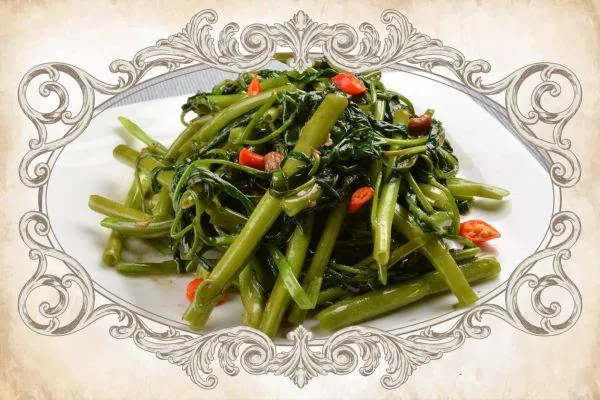 Commonly known as water spinach or water convolvulus, this mildly nutty tasting vegetable with crunchy stems and tender leaves is best enjoyed stir-fried with pungent sambal