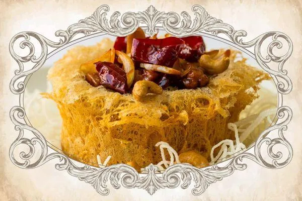 Ambrosian crisp-fried yam paste basket brimming with an assortment of cashews, onions, dried chilli and tender pieces of chicken thigh in a kaleidoscope of spicy, tart and sweet flavours from the kung pao sauce