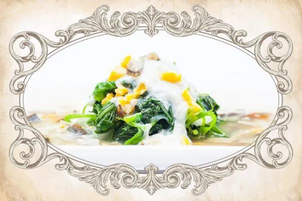 Three different eggs (century egg, salted egg and regular chicken egg) bestow distinctive flavours to the tender spinach in this healthy, wholesome dish with delectable soupy gravy