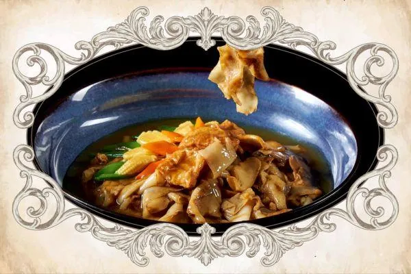 Wok-fried hor fun with mushrooms, vegetables & beancurd skin in vegetarian oyster sauce