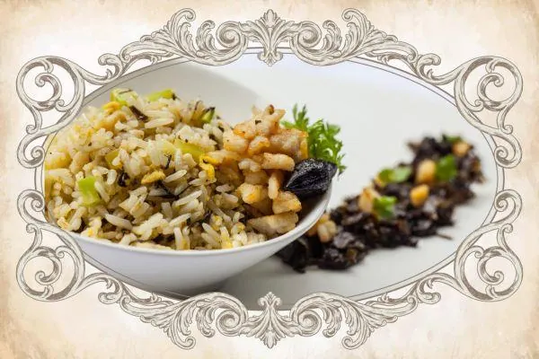 Wok-fried rice with preserved Chinese olives, mushrooms & diced vegetables