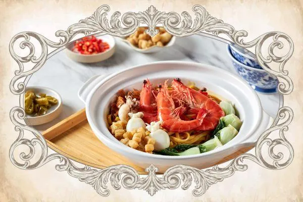 Dry-style Kuala Lumpur-sourced noodles (Yi Mian) masterfully braised to retain their springy texture. Served with mushrooms, live prawns & other premium seafood