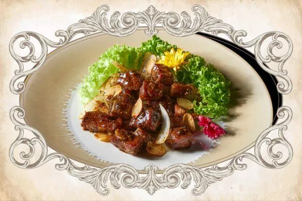 Boneless spare ribs slow-braised in traditional ‘red yeast rice’ paste, served with 2 crispy fried mantous