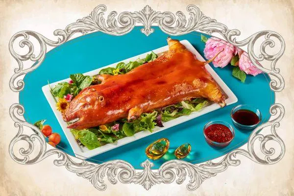A pure enjoyment of crispy skin, charcoal fire-roasted to a glistening golden brown. The secret of our 30-day old piglet, so robust in flavour, lies in the special chilli sauce painted on the underside. Each crispy piece of skin is best savoured dipped in the thick sweet sauce